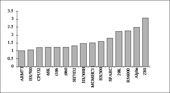 32-разрядный RISC код архитектуры фирмы ARM всегда считался исключительно плотным кодом. Действительно, результаты показывают, что плотность естественного кода ARM близка к плотности кодов традиционных 16-разрядных процессоров, оставляя другие 32-разрядные ядра RISC далеко позади. Это результат новых возможностей системы команд ARM, таких как условное выполнение каждой команды и опции обратной записи регистра.