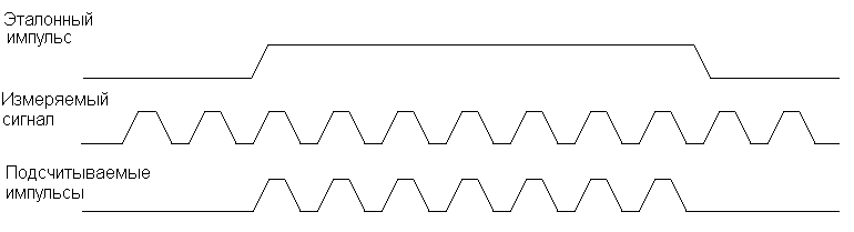 Рисунок 9. Программа измерения длительности импульсов Если теперь на вход микроконтроллера INT0 подать импульс с неизвестной длительностью, то в регистрах TH0 и TL0 будет записана его длительность в микросекундах. Использование таймера в качестве частотомера. Известно, что измерение частоты можно произвести, подсчитав количество периодов неизвестной частоты за единицу времени. Принцип измерения частоты иллюстрируется рисунком 10.