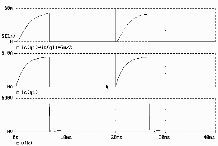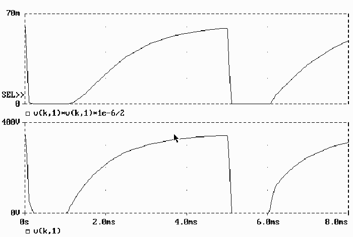 Рис. 3В машинах с классической схемой, где искра формируется за счет прерывания тока в достаточно высокоомной катушке механическим прерывателем, проблем еще больше. Замена механического контакта на электронный их не решает, и применение электронных коммутаторов от “Самар” или им подобных в автомобилях с высокоомной катушкой не дает ничего, кроме снижения токовой нагрузки на контакт. Дело в том, что RL параметры катушки должны удовлетворять противоречивым требованиям. Во-первых, активное сопротивление R должно обеспечивать достаточный ток для накопления необходимого количества энергии при пуске, когда напряжение аккумулятора может упасть в 1,5раза. С другой стороны, слишком большой ток приводит к преждевременному выходу из строя контактной группы. Во-вторых, для увеличения количества запасенной энергии необходимо увеличивать индуктивность катушки, но при этом с ростом оборотов ток в катушке не успевает достигнуть номинального значения. Например, в системах зажигания ВАЗ2101-2107 при частоте вращения коленчатого вала 6000об/мин ток разрыва катушки падает в полтора раза, а мощность, соответственно, более чем в два, что приводит к повышенному расходу топлива. Сказанное иллюстрируется эпюрами, приведенными на рис.2 и 3, где (снизу вверх) показаны напряжение на контакте прерывателя, ток катушки и запасенная энергия. Все эпюры получены при моделировании электронных схем систем зажигания с помощью программы PSPICE. Из графиков видно, что при увеличении частоты вращения вала с 1500об/мин до 6000об/мин (что соответствует частоте искрообразования 50Гц и 200Гц), запасенная в катушке энергия падает с 50мДж до 20мДж. Наиболее полно преимущества электронной системы зажигания проявляются в конденсаторной системе с непрерывным накоплением энергии. Один из вариантов конденсаторной системы зажигания и описан в данной статье. Подобные устройства способны разрешить большинство противоречивых требований, предъявляемых к системе зажигания. В такой схеме высоковольтный конденсатор постоянно подзаряжается от вспомогательного генератора, силовой транзистор подключает заряженный конденсатор к первичной обмотке, а катушка зажигания используется только как трансформатор. Энергию, запасенную в конденсаторе Ecap, можно определить следующим образом: Ecap=C*V2 /2,Где C – емкость, а V – напряжение на конденсаторе, которое выбирается исходя из необходимого напряжения вторичного пробоя. Обычно напряжение на первичной обмотке нормируется на уровне 300-350В. Наличие высокочастотного генератора и стабилизация напряжения делает величину запасаемой энергии независимой от напряжения аккумулятора и частоты вращения вала. Такая структура получается гораздо более экономичной, чем при накоплении энергии в индуктивности, так как ток через силовой транзистор и первичную обмотку катушки течет только в момент искрообразования. Кроме того высоковольтное напряжение на транзисторе стабилизировано и не зависит от напряжения вторичного пробоя, как в индуктивных системах, что повышает надежность работы силового транзистора. На рис.1 приведена упрощенная принципиальная схема блока электронного зажигания с непрерывным накоплением энергии и стабилизацией выходного напряжения. Подзарядка накопительного конденсатора С3 производится от импульсного высоковольтного трансформ