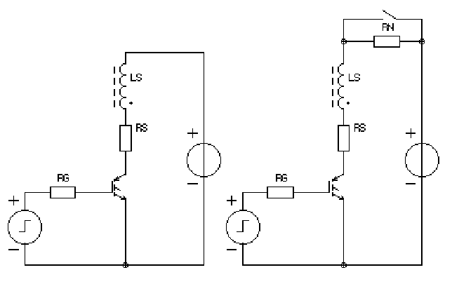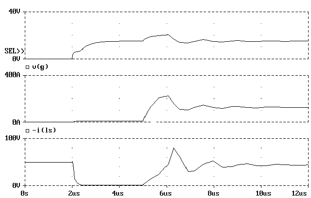 Рис. 2Принципиальная схема и эпюры напряжения, соответствующие этому ре-жиму, приведены на рис. 1а и 2. Все графики получены при анализе реальных схем с помощью программы PSpice. Для анализа били использованы усовер-шенствованные модели транзисторов MOSFET фирмы International Rectifier и макромодели IGBT и драйверов, разработанные автором статьи. Максимальный ток в цепи коллектора транзистора ограничен напряжением на затворе и крутизной транзистора. Из-за наличия емкости в цепи питания, внутреннее сопротивление источника питания не влияет на ток КЗ. В момент включения ток в транзисторе нарастает плавно из-за паразитной индуктивности LS в цепи коллектора (средний график на рис.2). По этой же причине напряжение имеет провал (нижний график). После окончания переходного процесса к транзистору приложено полное напряжение питания, что приводит к рассеянию колоссальной мощности в кристалле. Режим КЗ необходимо прервать через некоторое время, необходимое для исключения ложного срабатывания. Это время обычно составляет 1-10мкс. Естественно, что транзистор должен выдерживать перегрузку в течение этого времени. Принципиальная схема и эпюры напряжения, соответствующие этому режиму, приведены на рис. 1б и 3. Как видно из графиков, процессы в этом случае происходят несколько иначе. Ток, как и в предыдущем случае ограниченный параметрами транзистора, нарастает со скоростью, определяемой паразитной индуктивностью Ls (Средний график на рис.3). Прежде, чем ток достигнет установившегося значения, начинается рост напряжения Vce (нижний график). Напряжение на затворе возрастает за счет эффекта Миллера (верхний график). Соответственно возрастает и ток коллектора, который может превысить установившееся значение. В этом режиме кроме отключения транзистора необходимо предусмотреть и ограничение напряжения на затворе.