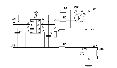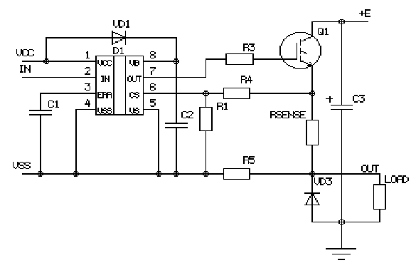Рис. 4Как было указано выше, если при появлении перегрузки уменьшить на-пряжение на затворе, период распознавания аварийного режима может быть увеличен. Это необходимо для исключения ложных срабатываний. Данная функция реализована в микросхеме IR2125. Конденсатор С1, подключенный к выводу ERR, определяет время анализа состояния перегрузки. При С1=300пФ, время анализа составляет около 10мкс. На это время включается схема стабилизации тока коллектора и напряжение на затворе снижается. Если состояние перегрузки не прекращается, то через 10мкс транзистор отключается полностью. Отключение защиты происходит при снятии входного сигнала, что позволяет пользователю организовать триггерную схему защиты. При использовании такой защиты особое внимание следует уделить выбору времени повторного включения, которое должно быть больше тепловой постоянной времени кристалла силового транзистора. Тепловая постоянная времени может быть определена из графика теплового импеданса Zthjc. Описанный способ включения транзистора имеет свои недостатки. Резистор RSENSE должен быть мощным и безындуктивным (серийно выпускаемые витые мощные резисторы имеют недопустимо высокую паразитную индуктивность). Кроме того он создает дополнительные потери мощности, что снижает эффективность схемы. На рис.5 приведена схема, свободная от указанных недостатков. В этой схеме для анализа ситуации перегрузки используется зависимость напряжения насыщения от тока коллектора. Для MOSFET транзисторов эта зависимость практически линейна, т.к. сопротивление открытого канала мало зависит от тока стока. У IGBT график Von=f(Ic) нелинеен, однако точность его вполне достаточна для выбора напряжения, соответствующего току требуемому защиты. Для анализа состояния перегрузки по напряжению насыщения измерительный резистор не требуется. При подаче положительного управляющего сигнала на затвор, на входе защиты драйвера SC появляется напряжение, определяемое суммой падения напряжения на открытом диоде VD2 и на открытом силовом транзисторе Q1 и делителем R1, R4, который задает ток срабатывания. Падение напряжения на диоде практически неизменно и составляет около 0,5В. Напряжение открытого транзистора при выбранном токе КЗ определяется из графика Von=f(Ic). Диод VD2, как и VD1 должен быть быстродействующим и высоковольтным.