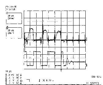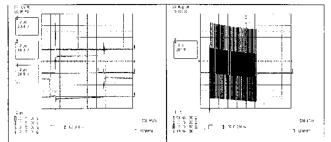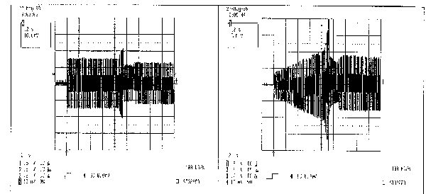 В процессе режима подогрева напряжение на резисторе R26 не измеряется. Однако, в конце режима подогрева (в начале режима поджига линейно меняющимся напряжением) инициируются схемы обнаружение жесткого переключения и перегрузки по току. Если после этого в любой момент величина напряжения на резисторе R26 поднимается выше порогового значения обнаружения перегрузки по току (1 В) на контакте CS микросхемы IC2, генерируется сигнал неисправности лампы, выходные МОП-транзисторы полумостовой схемы (М2 и М3) отключаются, и балласт переходит в режим работы при неисправности. Это может произойти, если не удается поджечь лампу или разомкнута цепь верхнего электрода. В случае неудачного поджига лампы ток через полумостовую схему увеличивается, и, таким образом, напряжение на резисторе R26 растет и превосходит порог перегрузки по току, генерируя сигнал неисправности. На Рис. 15 показано напряжение на резисторе R26 и напряжение на лампе в момент, когда балластное сопротивление обнаруживает неудавшийся поджиг и переходит в режим работы при неисправности. Рис. 16 показывает напряжение на лампе в конце режима подогрева и в режиме поджига линейно меняющимся сигналом в случае неудачного поджига лампы. Если разомкнута цепь верхнего электрода, происходит жесткое переключение на выходе полумостовой схемы, и каждый раз, когда включается нижний МОП-транзистор (М3), генерируется импульс мощного тока, и, таким образом, возникает импульс высокого напряжения на резисторе R26, сигнализирующий о неисправности. Рис. 17 иллюстрирует процесс жесткого переключения. На Рис. 18 показано напряжение на лампе при режиме подогрева и в начале режима поджига линейно меняющимся сигналом в процессе жесткого переключения при обнаружении неисправности. Балласт продолжает работать в режиме при неисправности до тех пор, пока не будет выключено и опять включено напряжение питания или заменена лампа.