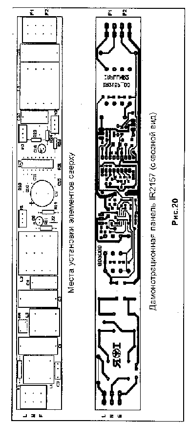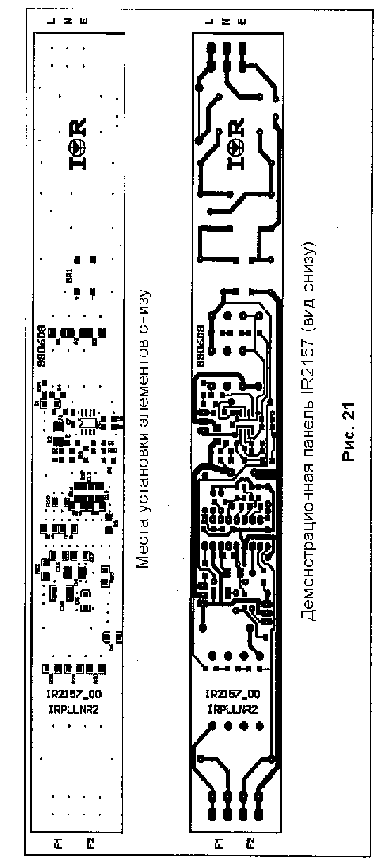 Схема печатной платы приведена на Рис. 20 и 21 (обратите внимание, что масштаб не соблюден). На Рис. 20 показан вид демонстрационной платы IR2157 сверху (сквозной) с указанием мест установки элементов, требующих сквозных отверстий. На Рис. 21 показан вид панели снизу с указанием мест установки элементов, монтируемых на поверхности. При конструировании монтажной платы применялись приемы для уменьшения влияния паразитных сопротивлений и индуктивностей на работу схем управления. Были предприняты меры для разделения цепей мощного тока и наиболее чувствительных цепей управления. Об этом свидетельствуют раздельные цепи обратных связей чувствительных элементов управления синхронизацией генератора и управления лампой с контактом COM микросхемы IC2. Такая же схемотехника использована для соединений вспомогательных элементов микросхемы IC1. Каждая микросхема имеет развязывающий конденсатор, непосредственно примыкающий к контактам подвода питания. Это необходимо для минимизации влияния мощных токов переключения, протекающих через балластное сопротивление и вызванных модуляцией напряжения питания микросхем. В каждом из случаев применен керамический конденсатор малой емкости (0.1 мкФ), соединенный параллельно с электролитическим конденсатором большей емкости.