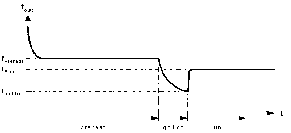 Во время режима поджига линейно изменяющимся сигналом напряжение на контакте CPH микросхемы IC2 продолжает линейно расти до тех пор, пока оно не достигнет порога включения рабочего режима (5.1 В).