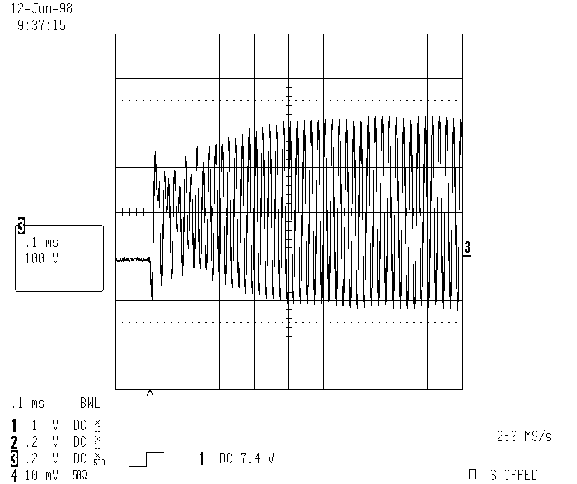 На Рис. 6 представлен график зависимости частоты колебаний в полумостовой схеме от времени для всех нормальных режимов работы: режимов подогрева и поджига линейно изменяющимся сигналом и рабочего режима. Как видно из Рис. 6, существует начальная пусковая частота, значительно превышающая частоту в установившемся режиме подогрева, который быстро завершается. Эта начальная пусковая частота задается элементами C13 и R17. Это сделано, чтобы обеспечить ограничение напряжения на электродах лампы при запуске ниже минимального напряжения поджига лампы. Если при возникновении генерации в полумостовой схеме напряжение на электродах лампы достаточно велико, происходит видимая вспышка в лампе, чего следует избегать. Это режим холодного поджига лампы, который может уменьшить срок ее службы. Осциллограмма напряжения на электродах лампы при запуске приведена на Рис. 7 и 8. На Рис. 7 показано напряжение на лампе без высокой начальной пусковой частоты, в то время как на Рис. 8 показано напряжение на лампе при запуске с высокой начальной частотой.