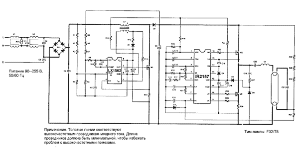 Демонстрационная плата IR2157: линейный электронный балласт (ЭПРА) для 32Вт флуоресцентной лампыХарактеристики