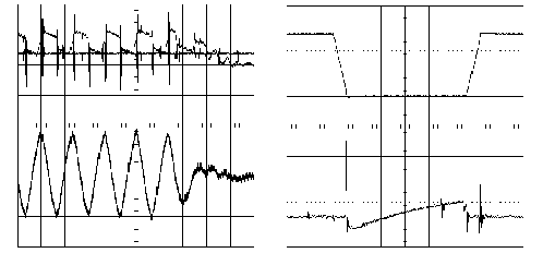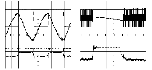 Схема защитыСхема защиты включает две ИС счетверенных компараторов (IC2 и IC4), фильтр детектора тока (R21, R22, C16 и D12), схему защиты при замене лампы ( R23, R24, R25, R26, D16 и C22) и датчиков перегрузки по току (R47, R48, R49, R43, R44, R46, D10 и D19). Более подробный чертеж схемы защиты приведен на рис 3. Фильтр детектора тока выпрямляет и интегрирует измеряемый резонансный ток лампы в истоке МОП ПТ нижнего плеча полумоста и сравнивает его с фиксированным пороговым напряжением. Ток должен превысить порог срабатывания в случае токовой перегрузки, обусловленной незажженным состоянием лампы или при ненулевом напряжении переключения полумоста, обусловленным отсутствием контакта или обрывом одного из катодов лампы. В этом случае напряжение на выводе CT ИС IR2153 фиксируется на уровне ниже внутреннего порога срабатывания (1/6 от Vcc) и балласт выключается. В случае замены лампы триггер-защелка обнуляется схемой защиты при замене лампы и напряжение на выводе CT ИС IR2153 удерживается ниже напряжения внутреннего порога срабатывания, но не в "зафиксированном" положении (рис 4). Когда вставлена новая лампа балласт автоматически начинает работать без перезапуска напряжения входной линии. При удалении лампы, частота работы балласта устанавливается на значение частоты режима предварительного подогрева, чтобы избежать выхода из строя ключей полумоста вследствие работы на частоте ниже резонансной , что может случиться в момент установки новой лампы.