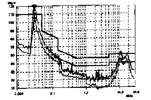Рис. 18. Типичный уровень помех для нуля относительно нуля(верхний график: квазипик, нижний график: среднее значение).Также показано предельное значение для EN55015.Перечень элементов балласта