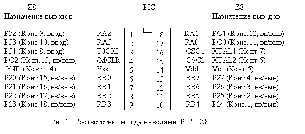 Таблица 1. Соответствие между выводами МК PIC и МК Z8