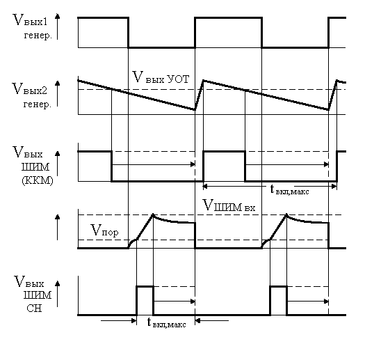 Поляков В.Д., Барышников А.Н. Применение комбинированного контроллера TDA16888 в типовых источниках питанияПредставляем на суд специалистов новую разработку фирмы Infineon Technologies (Siemens) в области источников питания для промышленного применения. Предлагаемая фирмой новая ИС TDA16888 обладает рядом положительных свойств, повышающих надежность и качество электропитания. Данный материал является авторским обзором оригинальных публикаций фирмы-разработчика по данной ИС. 1. Общая характеристикаИнтеграционная схема (ИС) TDA16888 предназначена для новых поколений источников питания с активной коррекцией коэффициента мощности (ККМ), режимом ожидания и широким диапазоном входного напряжения (90 - 270 В), т.е. дл персональных компьютеров, мониторов, телевизоров и промышленного применения. Это совершенное исполнение комбинированного контроллера оптимизировано, чтобы обеспечить электромагнитную совместимость, уменьшить системные затраты, реализовать схемные решения для широкого диапазона применений. ИС разработана по правилам FMEA (эффективного анализа повреждений), которые ставят условием, что простой сбой не должен приводить к неконтролируемым выходам из строя и гарантировать риск от пожара. TDA16888 предназначена для управления двухступенчатой топологией ККМ и ШИМ преобразователи синхронизированы внутренним генератором. Частота генератора устанавливается с помощью внешнего резистора R24, подключенного к выводу 16 и земле. Соответствующий времязадающий конденсатор встроен, чтобы гарантировать низкий ток потребления и высокую устойчивость против электромагнитных помех. Внутренний генератор работает с удвоенной внешней частотой для точного ограничения длительности цикла ШИМ (50%) при помощи триггера (рис.3). ККМ работает с максимальной длительностью цикла 94%, чтобы получить минимальные паузы потребляемого тока. Генератор может быть синхронизирован с внешним задающим сигналом, поданным на вывод 12. ККМ преобразователь имеет мультисхемное управление. При нормальной работе ККМ-схемы TDA16888 работает с двойной цепью управления. Первая цепь отслеживает форму потребляемого тока, обеспечивая средне токовый режим управления, как в режиме непрерывного, так и прерывистого тока. Вторая цепь стабилизирует напряжение в промежуточной цепи постоянного тока. Сигнал обратной связи по напряжению с делителя R13, R14 поступает на вход 17 микросхемы. Выходной сигнал усилителя ошибки на выводе 18 умножается с током на выводе 1, полученным при помощи RCR фильтра (на резисторах R4A, R4B и конденсаторе С9) из выпрямленного входного напряжения. Ток выхода умножителя формируется подобно входному напряжению, а его амплитуда изменяется в зависимости от выходного напряжения усилителя ошибки напряжения. Ток, пропорциональный потребляемому, поступает на вход усилителя ошибки тока (вывод 4 ИС), где вычитается из тока выхода умножителя. Выходное напряжение усилителя ошибки тока (выход 3 ИС) поступает на широтно-импульсный модулятор, где сравнивается с пилообразным напряжением, поступающим с выхода генератора (рис. 3). Выходной каскад широтно-импульсного модулятора (драйвер ККМ) формирует на выводе 8 ИС напряжение управления силовым транзистором VT1. Для частотной коррекции в цепи обратной связи усилителя ошибки тока включены элементы С7, С8, R8 а в цепи обратной связи усилителя ошибки